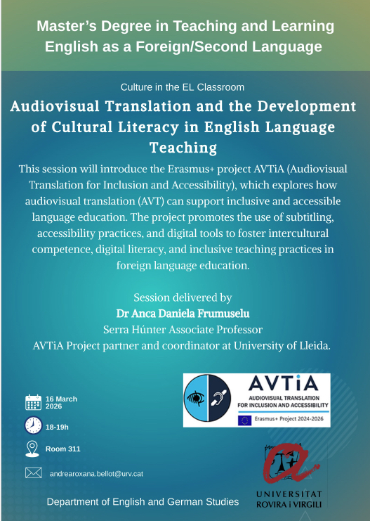 El dilluns 16 de març, es presentarà el projecte Erasmus+ AVTiA (Audiovisual Translation for Inclusion and Accessibility), que explora com la traducció audiovisual (AVT) pot donar suport a una educació lingüística inclusiva i accessible.